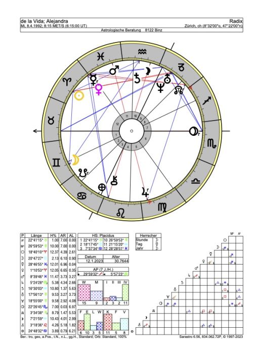 Die Geburtskonstellation (Radix) von Alejandra macht im Zusammenspiel der kosmischen Energien deutlich, dass Alejandra aussergewöhnliche Entwicklungsmöglichkeiten gegeben sind, mit denen sie künftig institutionell für die Gemeinschaft und für die Gesellschaft wichtige Aufgaben wird wahrnehmen können.
