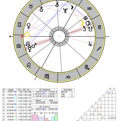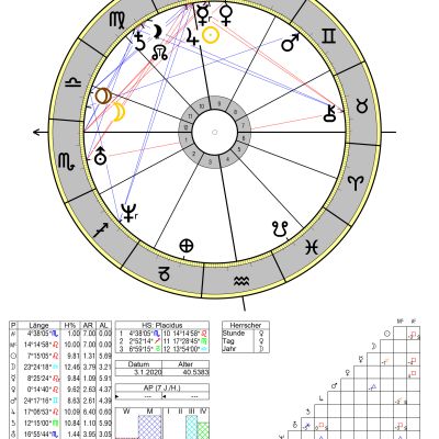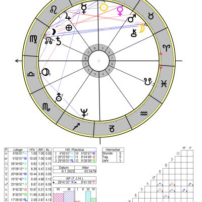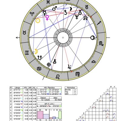 Die feurige gestaltungsfreudige Sonne im Widder steht im zwölften Haus, im Sextil zum Saturn im Wassermann im zehnten Haus sowie zum Mond in den Zwilligen im zweiten Haus. Venus als Geburtsherrscherin steht anfangs Widder in Konjunktion mit Merkur in den Fischen an der Spitze zu 12, und zwar sowohl im Trigon zu Chiron im vierten Haus wie auch zum MC (Kulminationspunkt) im Steinbock.