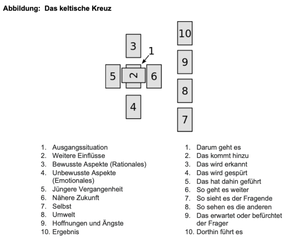 Die grösste Vorliebe habe ich jedoch für das keltische Kreuz, da die zehn Karten in dieser Auslegeordnung eine Geschichte erzählen, die symbolische Geschichte eines Menschen in Bildern, die es in eine Geschichte aus Worten zu übersetzen gilt, welche die Seele bereits bestens kennt (vgl. obenstehende Abbildung).